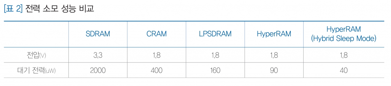 윈본드의 64Mb 하이퍼램을 예로 들면, 대기(Standby) 모드의 전력 소비는 90uW, 1.8V이지만, 같은 캐패시티(용량)의 SD램은 약 2000uW, 3.3V다. 더 중요한 것은 하이퍼램의 전력 소모는 하이브리드 슬립 모드(Hybrid Sleep Mode)에서 오직 45uW, 1.8V였고, 이는 SD램의 대기 모드에서와 상당한 차이를 보인다[표 2]. 저전력 SD램의 경우에도 전력 소모와 폼팩터 모두 하이퍼램보다 크다.
