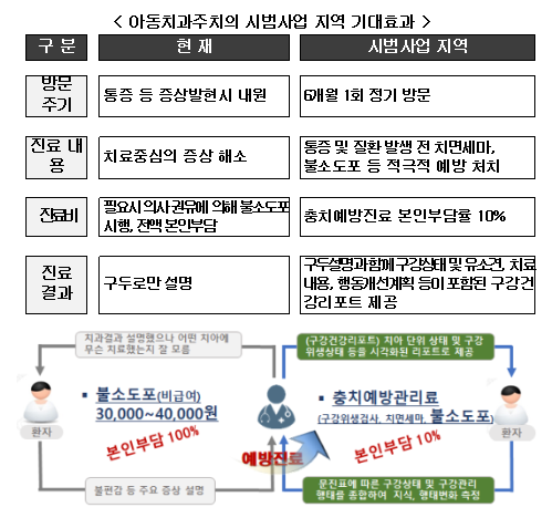 그간 치아가 아플 때 치과에 방문해 치료 중심으로 진료가 이뤄졌다면, 시범사업은 아동이 정기적으로 치과에서 구강 건강 상태를 점검받고, 결과에 따라 치면세마, 불소도포 등 적극적으로 예방서비스를 받게 된다.