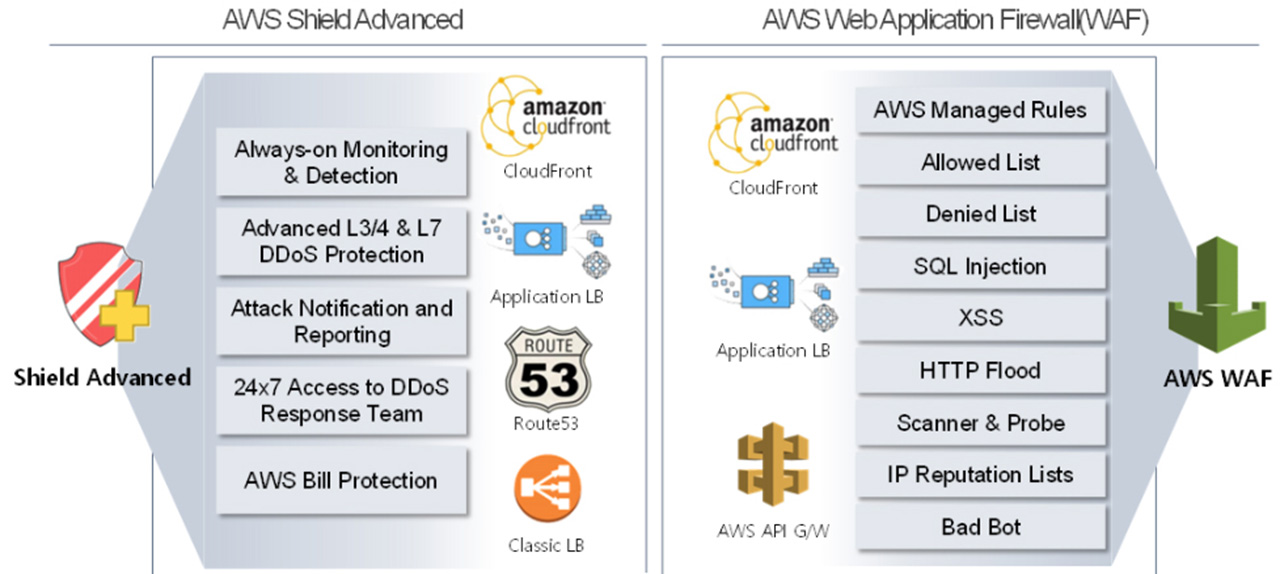 일례로, DDoS 공격으로부터 애플리케이션을 보호하는 관리형 보안기능인 AWS 쉴드(Shield) 서비스를 제공하고, 고객 환경에 보안 보호 계층을 추가하면서 외부 공격으로부터 애플리케이션을 보호하기 위해 AWS WAF (Web Application Firewall)서비스를 제공하고 있다.
