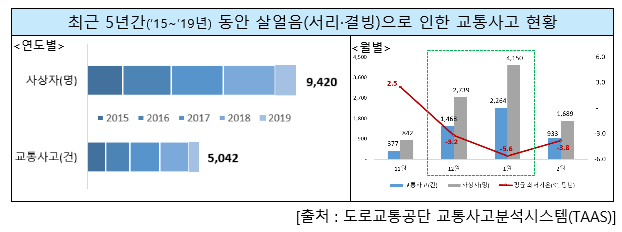 최근 5년(2015~2019년 중 11월~2월) 동안 도로 서리·결빙(살얼음 포함)으로 인한 교통사고는 총 5042건이며, 9420명의 사상자가 발생했다.