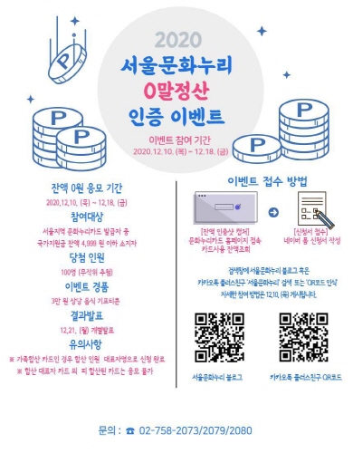 [테크월드=방제일 기자] 서울문화재단은 문화예술, 체육, 국내관광 분야에서 문화 활동을 할 수 있도록 지원하는 '문화누리카드'의 잔액 인증 이벤트 '0말정산'을 오는 10∼18일까지 진행한다.