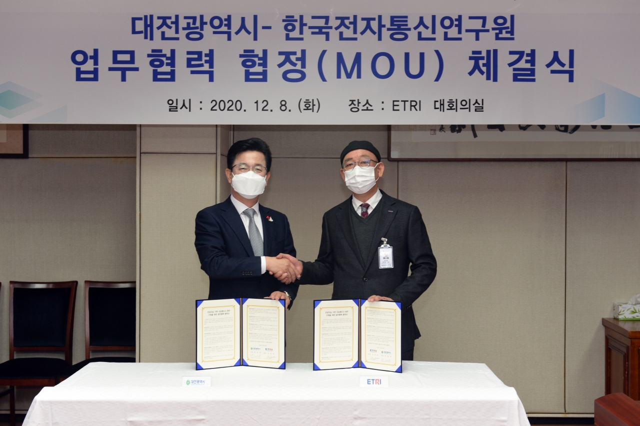 양 기관은 양해각서 체결을 통해 ▲AI 기반 대전시 디지털트윈 플랫폼 구축 ▲대전시 산업 경쟁력과 경제 활성화를 위한 ICT 적용 ▲대전시 실증 대상 ETRI 확보 기술 발굴, 협력 기획 ▲대전시-ETRI 협력 중장기 발전지도 개발과 표준 프로세스 확립 등을 진행할 예정이다.