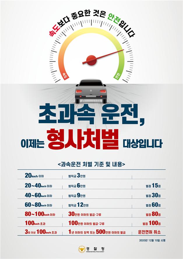 과거에는 제한속도 보다 60km/h 초과 시에는 일률적으로 범칙금(12만 원)과 운전면허 벌점만 부과할 뿐 형사처벌은 없었지만 앞으로는 제한속도 보다 80km/h를 초과하는 속도로 운전하는 경우에는 형사처벌을 받게 되며, 3번 이상 100km/h를 초과해 운전할 경우에는 형사처벌은 물론 운전면허도 취소된다.