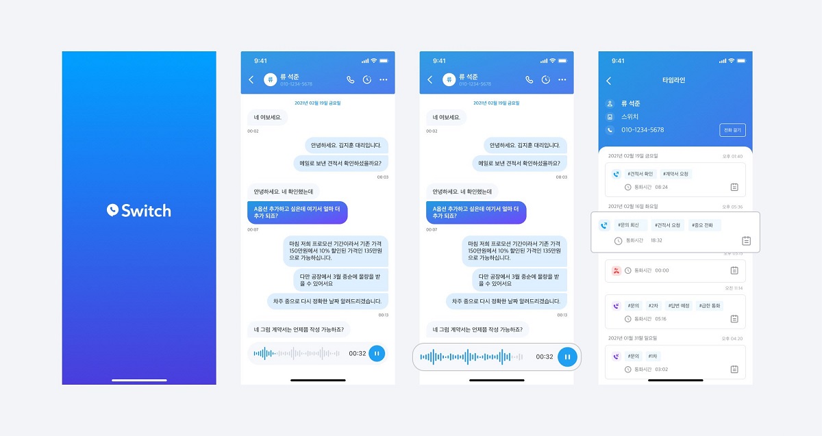 이번 스위치 iOS 정식 버전은 ▲기본 전화 기능은 물론 ▲전화 녹음 ▲통화 내용의 실시간 대화형 문자 기록 ▲통화 기록 조회와 분석까지 원스톱으로 지원한다. 단순히 통화 내용을 녹음하는 것에 그치는 것이 아닌, 효율적인 전화 업무를 돕는 음성 데이터 관리까지 앱 하나로 가능해 새로운 전화 경험을 누릴 수 있다.