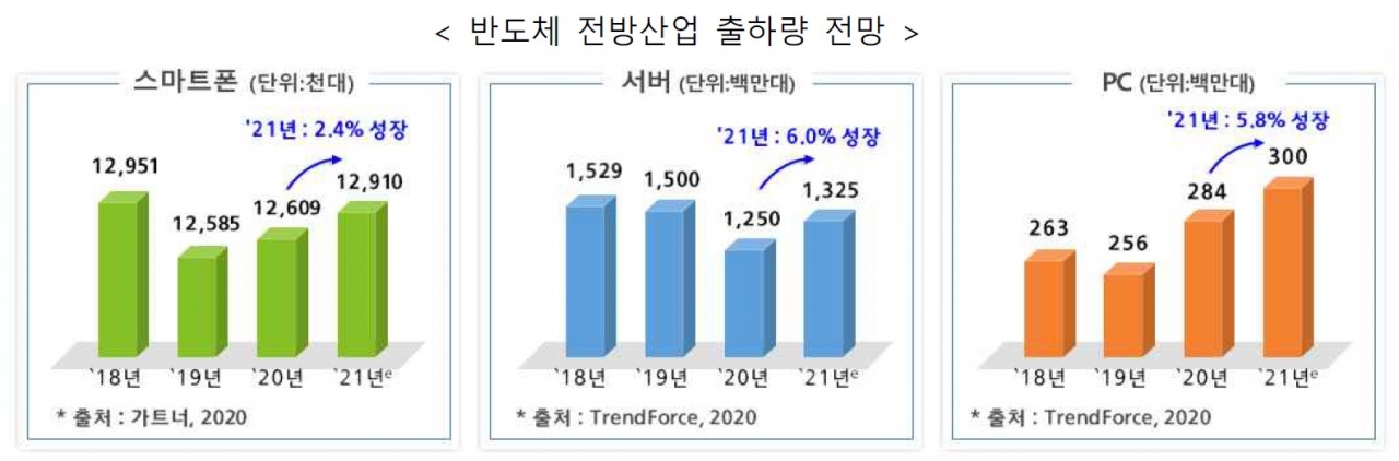 산업부에 따르면 코로나19로 인한 글로벌 경기침체 상황에서도 반도체 산업은 수출 회복세를 주도해 우리경제의 버팀목 역할을 담당한 것으로 평가된다. 모바일향 수요는 부진했으나, 비대면 경제 가속화에 따른 서버·노트북 분야 수요 견조로 선방한 것으로 보인다. 모바일향 수요는 향후 5G 본격화, 중국 시장 스마트폰 점유율 확보 경쟁 등에 따라 하반기부터 수요를 회복하는 추세를 나타냈다.