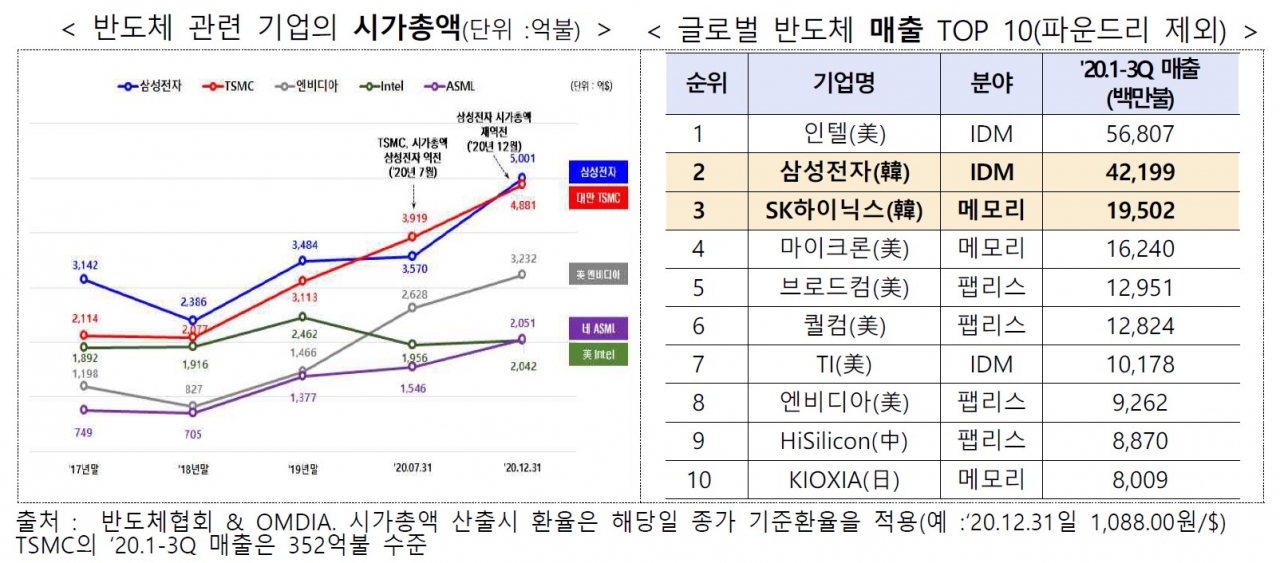 반도체 분야에서의 투자는 한국이 2017~2018년 반도체 슈퍼사이클 이후 2019년 중국과 대만에 넘겨줬던 설비투자 1위 자리를 탈환할 것으로 산업부는 기대했다. 자본시장을 살펴보면 2020년 12월 말 종가 기준 국내 S사의 시가총액이 5001억 불로 TSMC의 4881억 불을 제치고 5개월만에 글로벌 반도체 시가총액 1위로 다시 올라섰다.