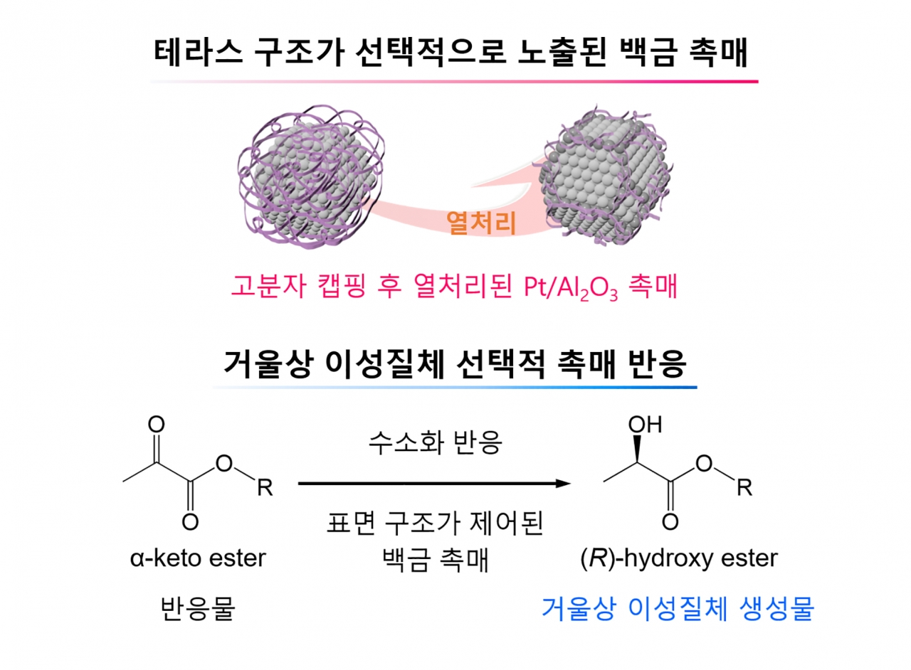 연구팀은 그중에서도 반응물·생성물과의 분리와 재사용이 쉬워 산업적 활용 측면에서 큰 장점이 있는 불균일계 촉매를 활용한 거울상 이성질체 선택적 촉매 반응을 연구해왔다. 수 나노미터 크기의 백금 나노입자 합성 과정에서 사용된 고분자들을 간단히 열처리함으로써 특정 표면 구조만 노출된 백금 촉매를 제조하는 데에 성공했다.