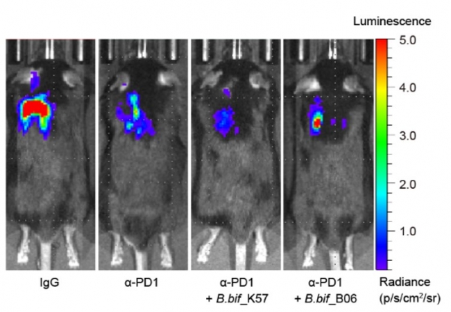연구팀은 암 모델 마우스에서 비피도박테리움 비피덤과 면역항암제 (anti-PD-1) 병용 투여시 같은 비피도박테리움 비피덤 종이라도 균주마다 암 억제 정도가 다른 것을 확인했으며, 균주와 면역항암제 병용 투여 시 면역항암제 단독 투여보다 유의하게 암을 더 억제하는 비피도박테리움 비피덤 균주를 발굴했다.
