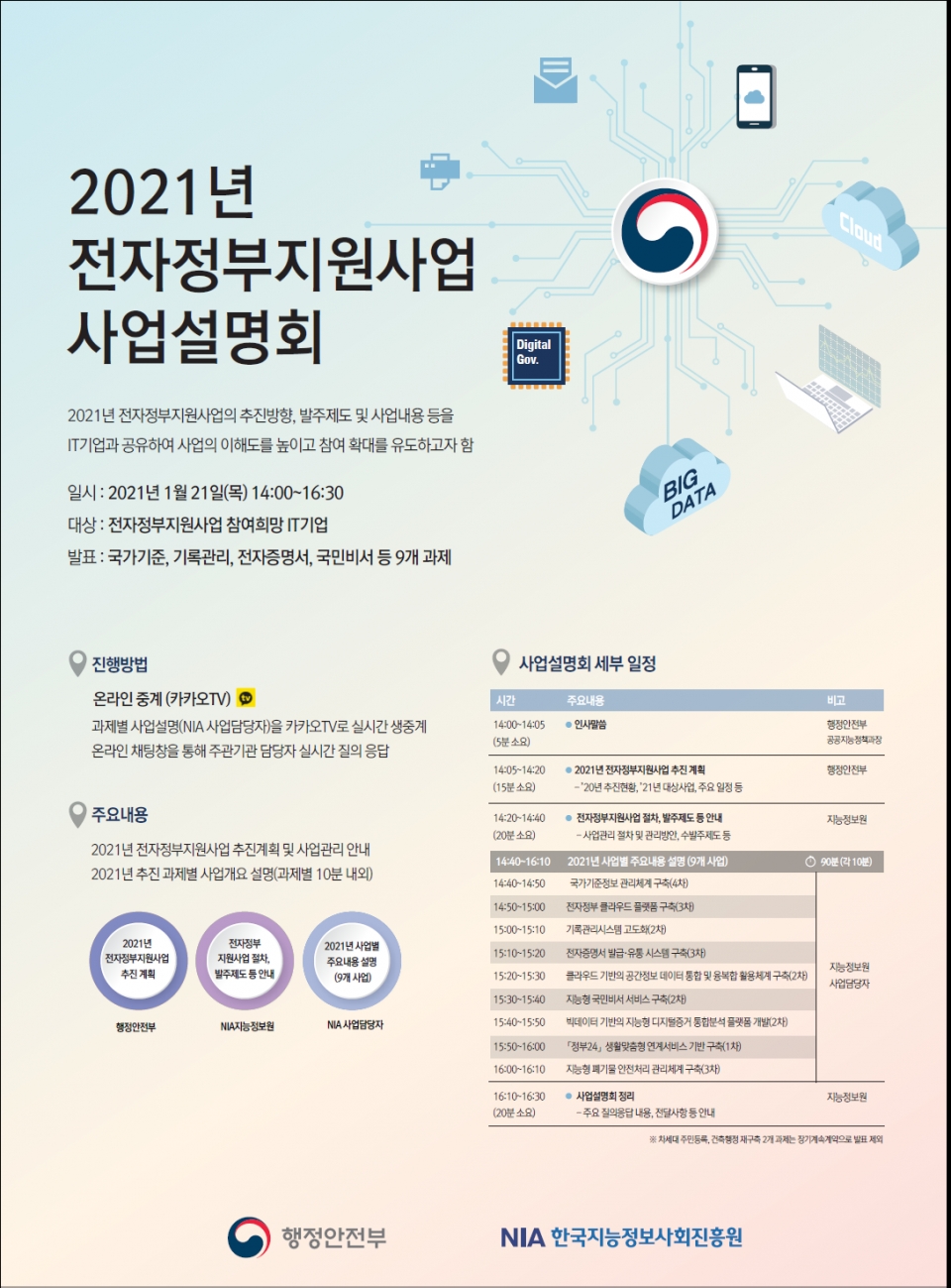 행정안전부(이하 행안부)는 1월 21일 오후 ‘2021년 전자정부지원사업 사업설명회를 비대면 온라인 방식으로 개최한다고 밝혔다.