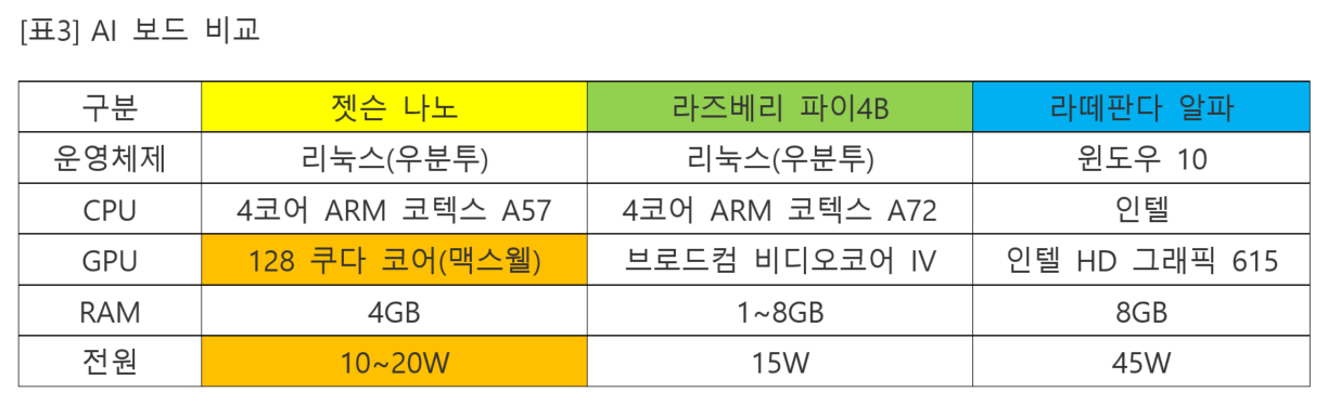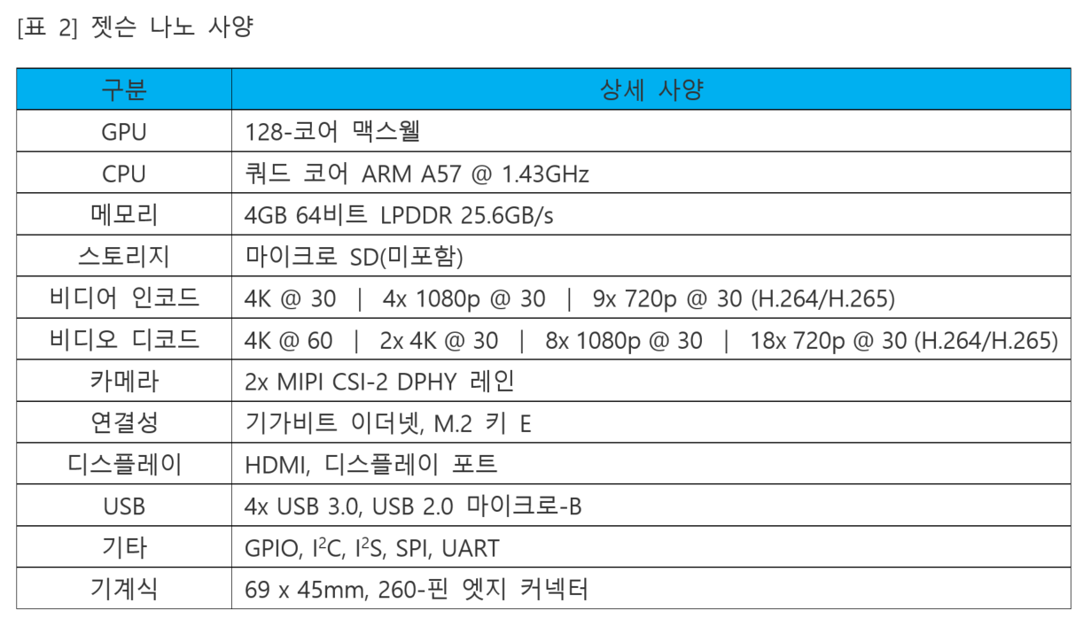일반적인 산업용 컴퓨터와 AI 프로젝트에 많이 사용되는 라즈베리파이4B, 라떼판다와 어깨를 견줄 수 있을 만큼 젯슨 나노의 성능은 뒤쳐지지 않는다. 오히려 GPU(그래픽카드) 부분에서 앞서 말했던 두 가지 제품보다 훨씬 뛰어난 성능과 가성비도 갖추고 있어 AI, 딥러닝 연산, 3D그래픽, 이미지 분류에 아주 특화된 싱글보드 컴퓨터로 분류된다. 텐서플로우 파이토치 등 여러 딥러닝 프레임워크와도 궁합이 좋으며, 개발용 보드로서 가성비와 퍼포먼스가 훌륭한 제품이다.