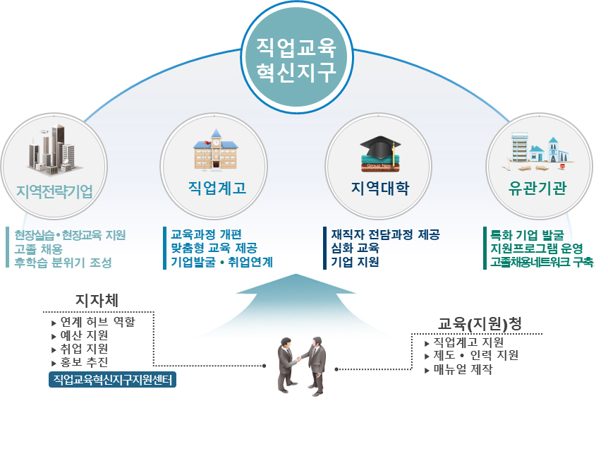 직업교육 혁신지구란 지자체와 교육청이 협력해 지역 산업 발전을 선도할 고졸 인재를 양성하도록 지역 직업계고와 지역기업·대학이 참여해 혁신지구 교육과정을 운영하는 직업교육 지원체계이다.
