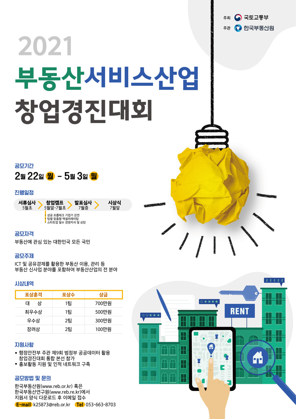 이에 따라 부동산서비스산업 관련 우수창업 아이템을 발굴하기 위한 경진대회 공모가 2월 22일부터 시작된다.