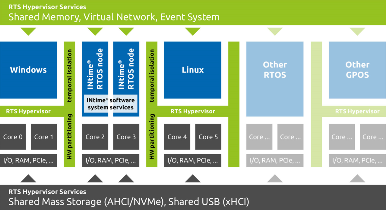 인타임 디스트리뷰티드(INtime Distributed) RTOS는 RTS 하이퍼바이저 내에서 작동하도록 반가상화됐다. 하드웨어 지원 가상화 기술은 실시간 애플리케이션을 다른 운영 시스템으로부터 안전하게 보호한다. 이를 통해 보안 능력이 크게 향상할 뿐 아니라, 인타임에서 실시간 애플리케이션들의 프로세서들이 계속 실행되는 동안에도 일반 운영 시스템을 재부팅할 수도 있다.