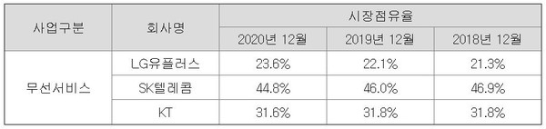 5일 LG유플러스의 사업보고서에 따르면 지난해 12월말 기준 이통 3사의 시장 점유율은 SK텔레콤 44.8%, KT 31.6%, LGU+ 23.6% 순이었다. 전년보다 SKT와 KT가 각각 1.2%포인트(p), 0.2%p 감소한 만큼 LGU+가 소폭 오른 결과다.