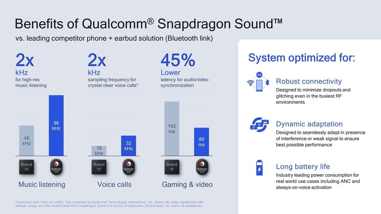 이용자와 기기 사이에서 음질이 방해받는 원인은 기기가 연결되는 방식, 연결 끊김, 오디오 끊김·결함, 지연 등이 있다. 스냅드래곤 사운드는 퀄컴 기술 스택 간 상호작용을 최적화해 주요 경쟁사 대비 2배 수준인 24비트 96kHz 수준의 음질을 제공한다. 또한 통화 시에는 32kHz 수준의 음질을 지원한다.