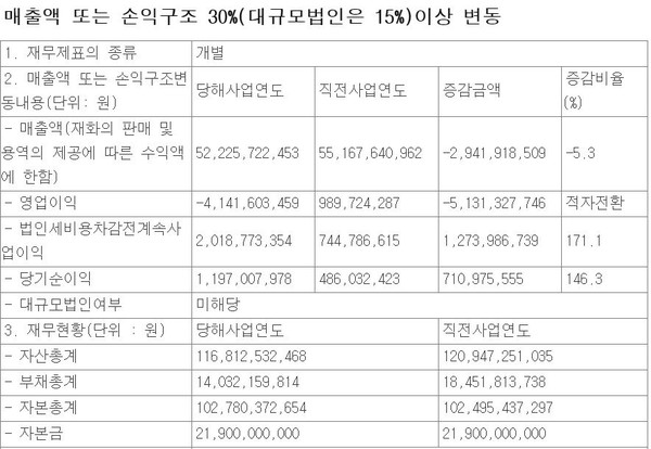 매출은 전년 동기 대비 5.3% 하락했다. 영업이익은 적자로 전환됐다. 지난해 동기 영업이익은 9억8972만원이었다.