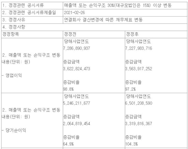 영업이익 증가율은 98.8%에서 97.2%로 정정했다. 대원미디어의 지난해 영업이익은 전년보다 35억6392만원이 증가한 72억2798만원이다. 앞서 회사는 해당 금액을 72억8689만원으로 공시했다.