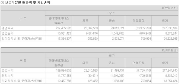 지난해 부문별 매출은 ▲인터넷비즈니스 솔루션 2174억6559만원(+14.5%) ▲의류 233억6251만원(-1.1%) ▲운송 298억1352만원(+38.7%)을 기록했다. 총 매출은 2473억3610만원으로 전년 동기 대비 13.9% 증가했다. 같은 해 4분기(10~12월) 매출은 전년 동기에 비해 17.3% 늘어난 706억6100만원이다.