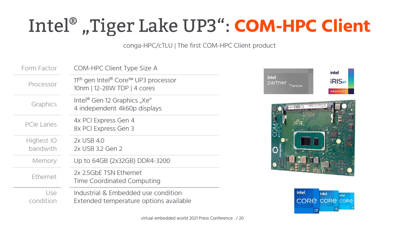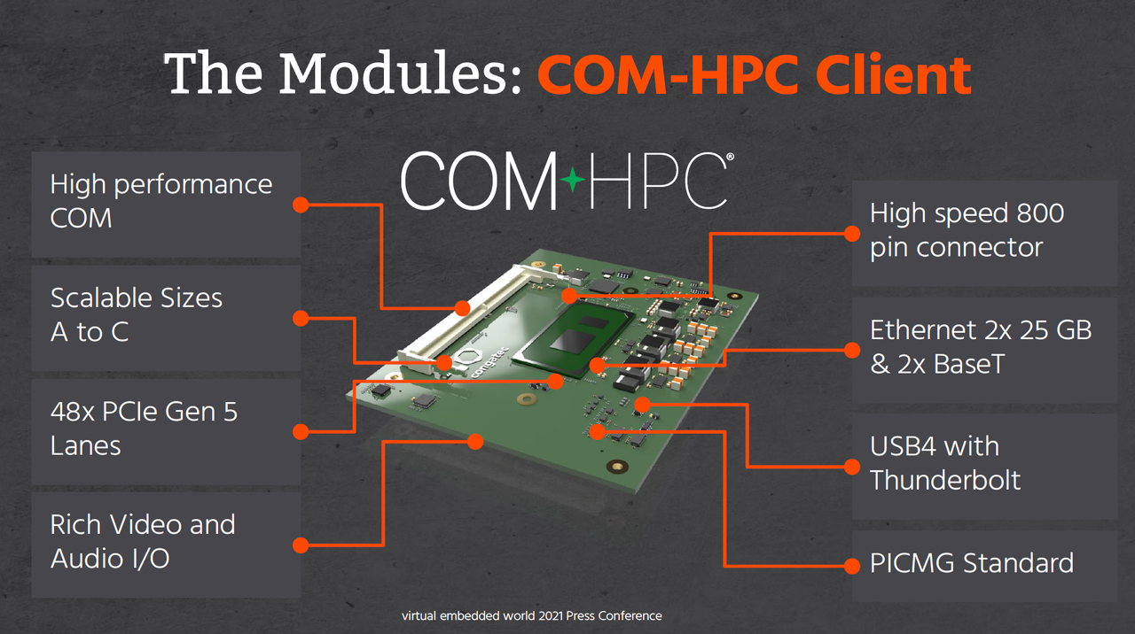 그러면서 주문 제작형 캐리어 보드인 COM-HPC에 대해 소개했다. 임베디드 컴퓨터에 대한 수요 증가로 새로운 클래스에 내장된 엣지 서버에 서비스를 제공하려면 확장성이 무제한이어야 한다. 하지만 포그 컴퓨팅을 위한 COM 익스프레스(COM Express)는 강력한 엣지 서버를 위한 충분한 인터페이스를 갖추지 못했다. 이에 콩가텍은 COM-HPC 클라이언트와 COM-HPC 서버 모듈을 발표했다(단 COM-HPC는 COM 익스프레스를 대체하지 않으며, 각각 특성에 맞게 다양한 분야에서 활용될 수 있다.).