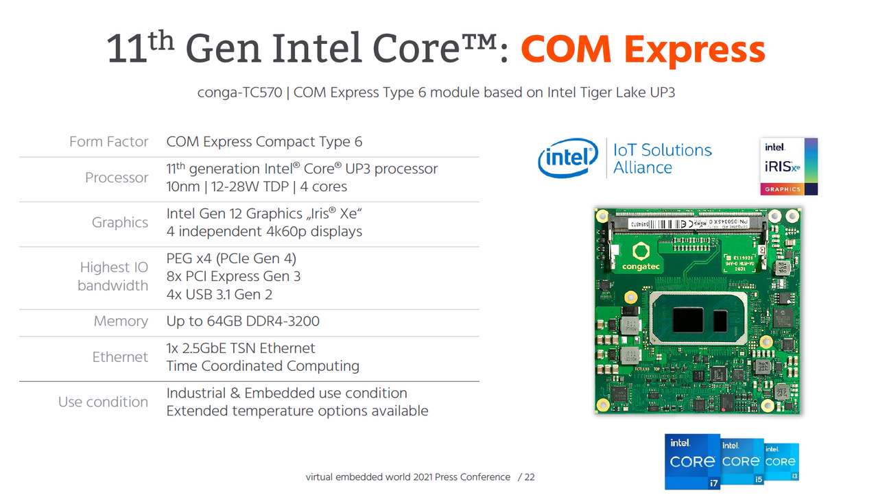 마틴 댄저(Martin Danzer) 콩가텍 제품관리 디렉터는 인텔 11세대 코어 프로세서를 탑재한 COM 익스프레스(Conga-TC750)를 소개했다. 이 모듈은 고객이 애플리케이션을 산업 환경에 구현하기 훨씬 쉽게 설계됐다. CPU에 내장된 인텔의 12세대 그래픽카드인 아이리스 Xe는 이전 세대에 비해 2배나 성능이 좋아 AI와 머신러닝 애플리케이션 활용면에서 탁월한 효과를 발휘한다. CPU와 GPU의 성능 향상뿐만 아니라 확장된 산업 온도 범위도 지원한다.