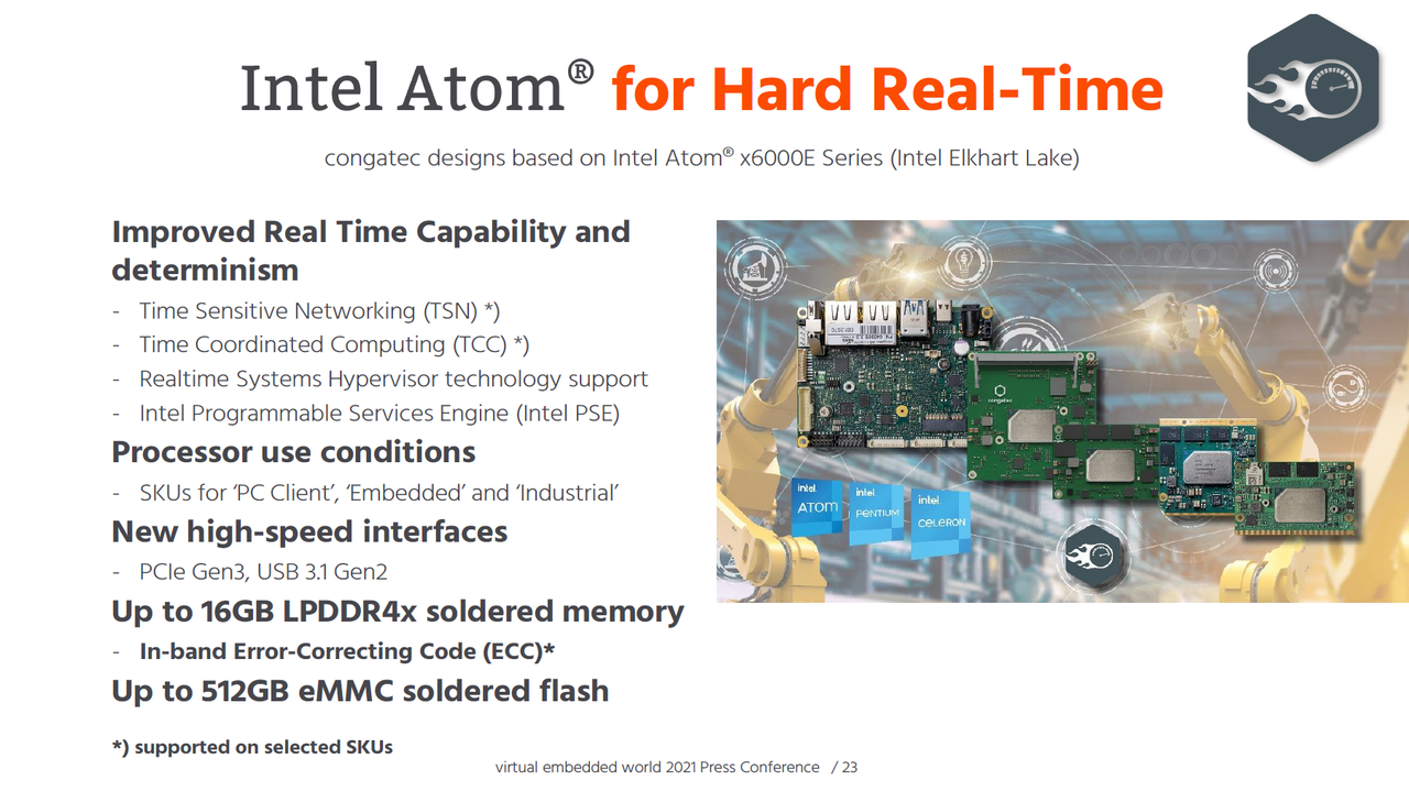댄저 디렉터는 강력한 실시간 지원 보드인 인텔의 아톰 x6000E 시리즈를 탑재한 모듈도 소개했다. 미래에는 스마트 산업에 5G를 직접 연결하기 위해선 언제 어디서나 실시간 인프라가 필요할 것으로 분석된다. 아톰 시리즈에 기반한 콩가텍 보드는 시간 민감형 네트워킹(TSN), 시간 조정 컴퓨팅(TCC), 실시간 시스템 하이퍼바이저 기술 지원을 통해 실시간 기능을 향상시킨다. 프로세서 사용 조건에 따라 PC 클라이언트용, 임베디드용, 산업용 제품군을 구분할 수도 있다.