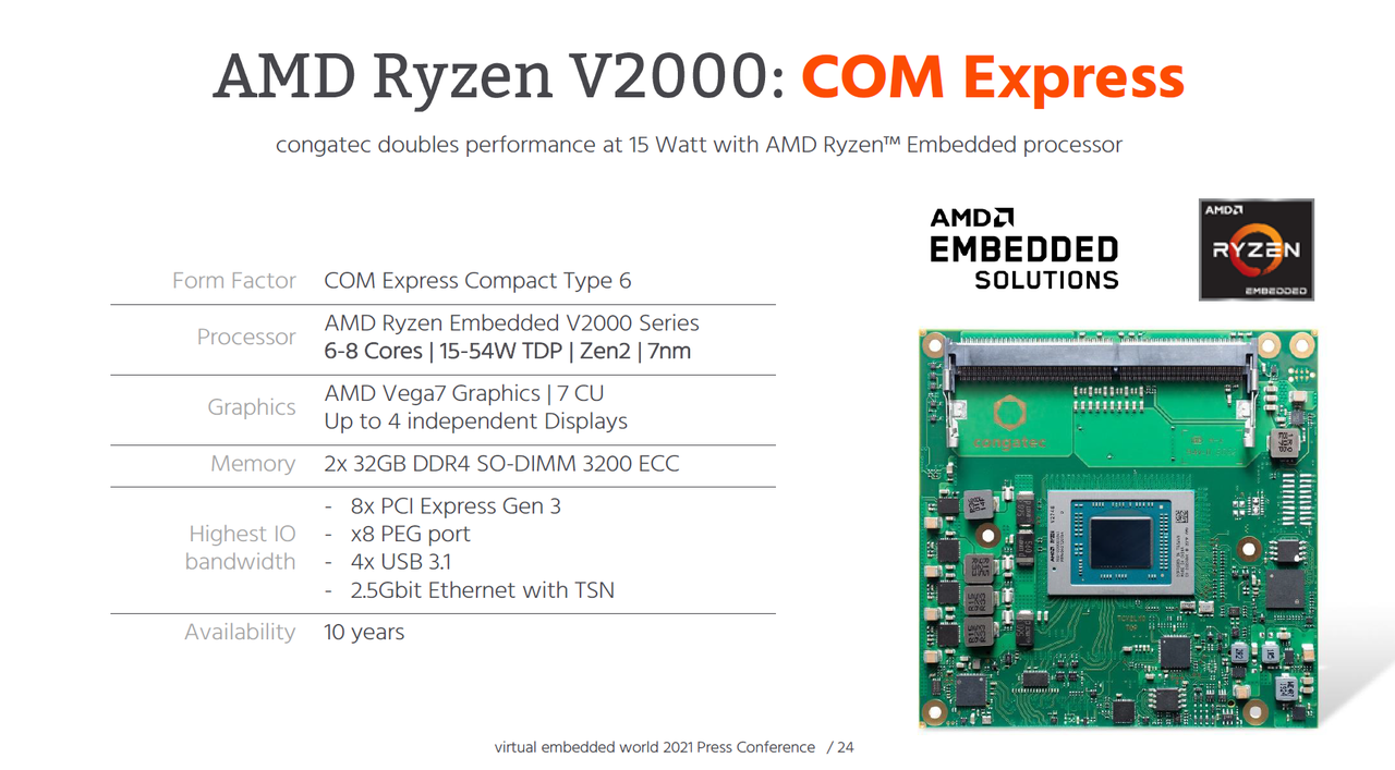 콩가텍은 AMD 라이젠 임베디드 V2000 프로세서를 탑재한 COM 익스프레스 콤팩트 컴퓨터 온 모듈(C0mputer-on-Module) Conga-TCV2도 공개했다. 이 제품은 이전에 출시된 AMD 라이젠 임베디드 V1000 대비 성능이 2배로 향상됐다.