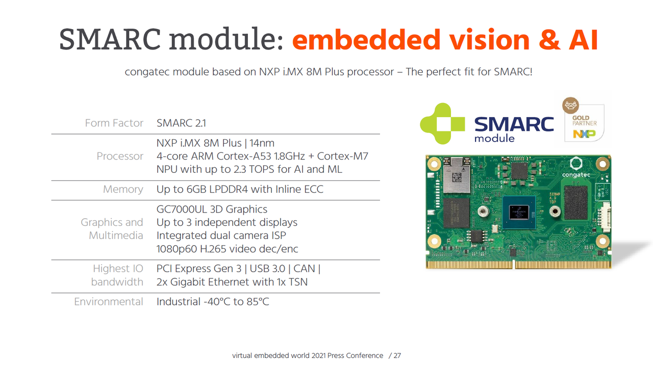 NXP는 현재 글로벌 차량용 반도체 분야에서 시장점유율 2위를 유지하고 있다. 콩가텍은 자동차의 전장화에 따라 성장 잠재력이 높은 NXP의 프로세서를 꾸준히 활용하고 있다. NXP i.MX 8M 미니, NXP i.MX 8X, NXP i.MX8 쿼드맥스를 탑재한 SMARC 모듈을 출시했으며, 이번 임베디드 월드에서 Arm Cortex-A53 기반 NXP i.MX 플러스 프로세서를 탑재한 저전력 SMARC 2.1 컴퓨터 온 모듈을 추가했다.