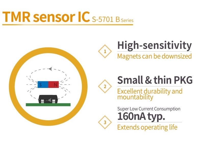 S-5701 B 시리즈는 TMR 센서 IC로, 이방성 자기 저항(AMR) 센서 IC나 거대 자기 저항(GMR) 센서 IC 등 다른 MR 센서 IC와 달리 고감도·저전류소비가 특징이다. 이러한 성능 덕분에 기존 리드 스위치의 한계를 해결할 수 있다.