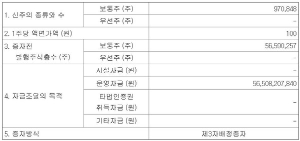 신주 발행가는 5만8205원이며 배당 기산일(배당금이 계산된 첫 날)은 지난 1월 1일이다. 납입일은 오는 22일이다. 양사는 서비스 혁신과 신사업 발굴을 우선 과제로 협력해 나갈 예정이다.
