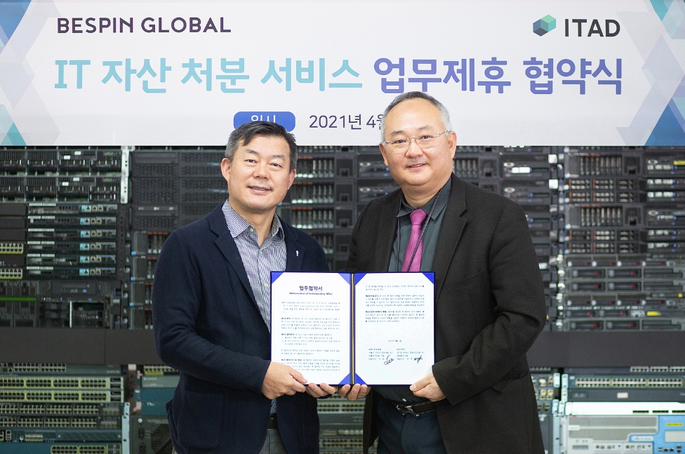 [테크월드뉴스=김경한 기자] 베스핀글로벌이 아이태드와 클라우드 환경에서 안전한 IT 자산 처분 서비스 제공을 위한 ‘IT자산 폐기(IT Asset Disposition) 및 데이터 보안 폐기 서비스 사업화’ 등의 협력을 목적으로 업무협약을 체결했다.