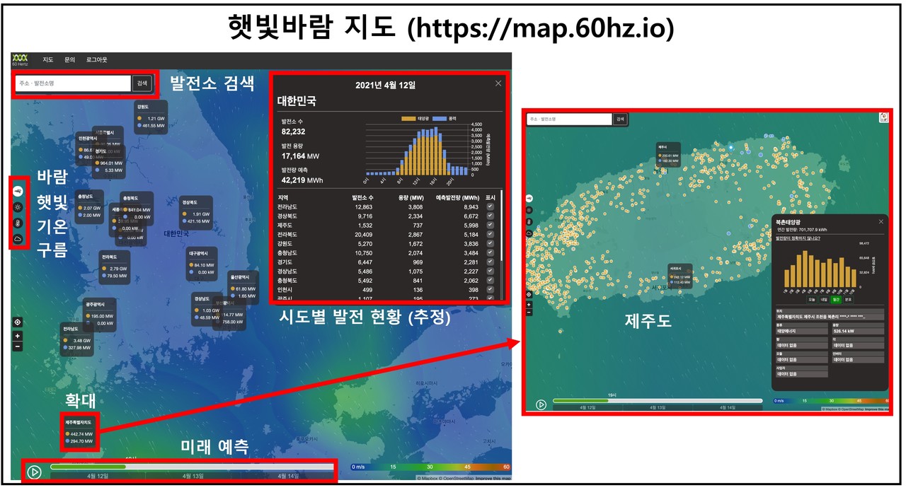 한편 식스티헤르츠는 대한민국 가상 발전소 개발과 함께 재생 에너지 발전량에 영향을 미치는 기상 정보와 현재 가동되고 있는 8만여 개 재생 에너지 발전소를 지도 위에 나타낸 ‘햇빛바람 지도’를 무료로 공개하고 있다.
