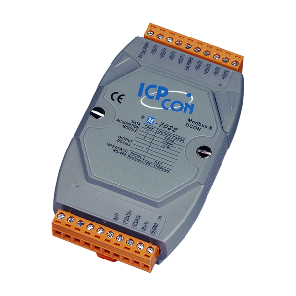 M-7022는 2채널, 12비트 아날로그 출력 모듈로 DCON 프로토콜을 사용해 전압과 전류 출력을 모두 사용하도록 설계됐다.