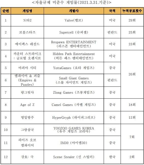 [테크월드뉴스=방제일 기자] 한국게임정책자율기구(이하 ‘기구’)는 한국게임산업협회(이하 ‘협회’)에서 시행하고 있는 강화된 “건강한 게임문화 조성을 위한 자율규제 강령(이하 ‘강령’)”에 따라 미준수 게임물을 2021년 4월 19일 29차 공표했다.