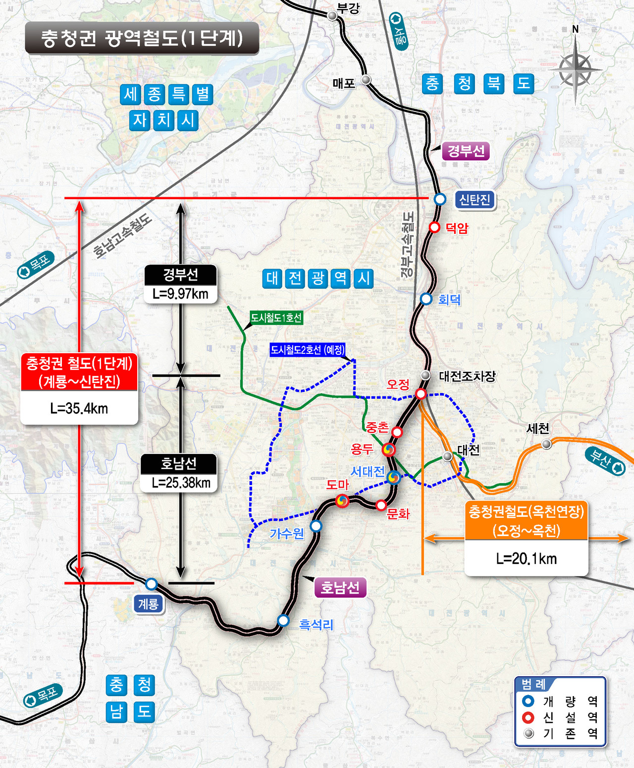 충청권 광역철도 1단계는 계룡~신탄진 구간(총 연장 35.4㎞)에 정거장 12개소를 설치(신설 6개, 개량 6개)하며, 총 사업비는 약 2307억 원(국고 1198억 원, 지방비 1109억 원)이다.