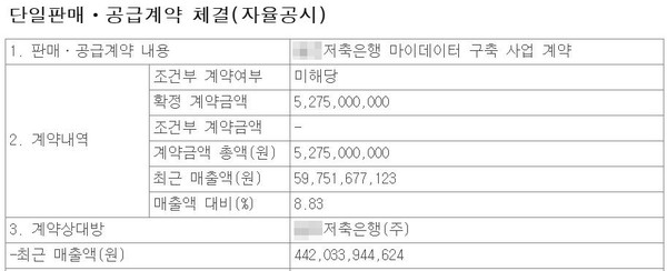 공급 대상은 A저축은행이다. 총 계약 금액은 52억7500만원이다. 최근 매출액(597억5168만원)의 8.83%에 해당하는 금액이다.