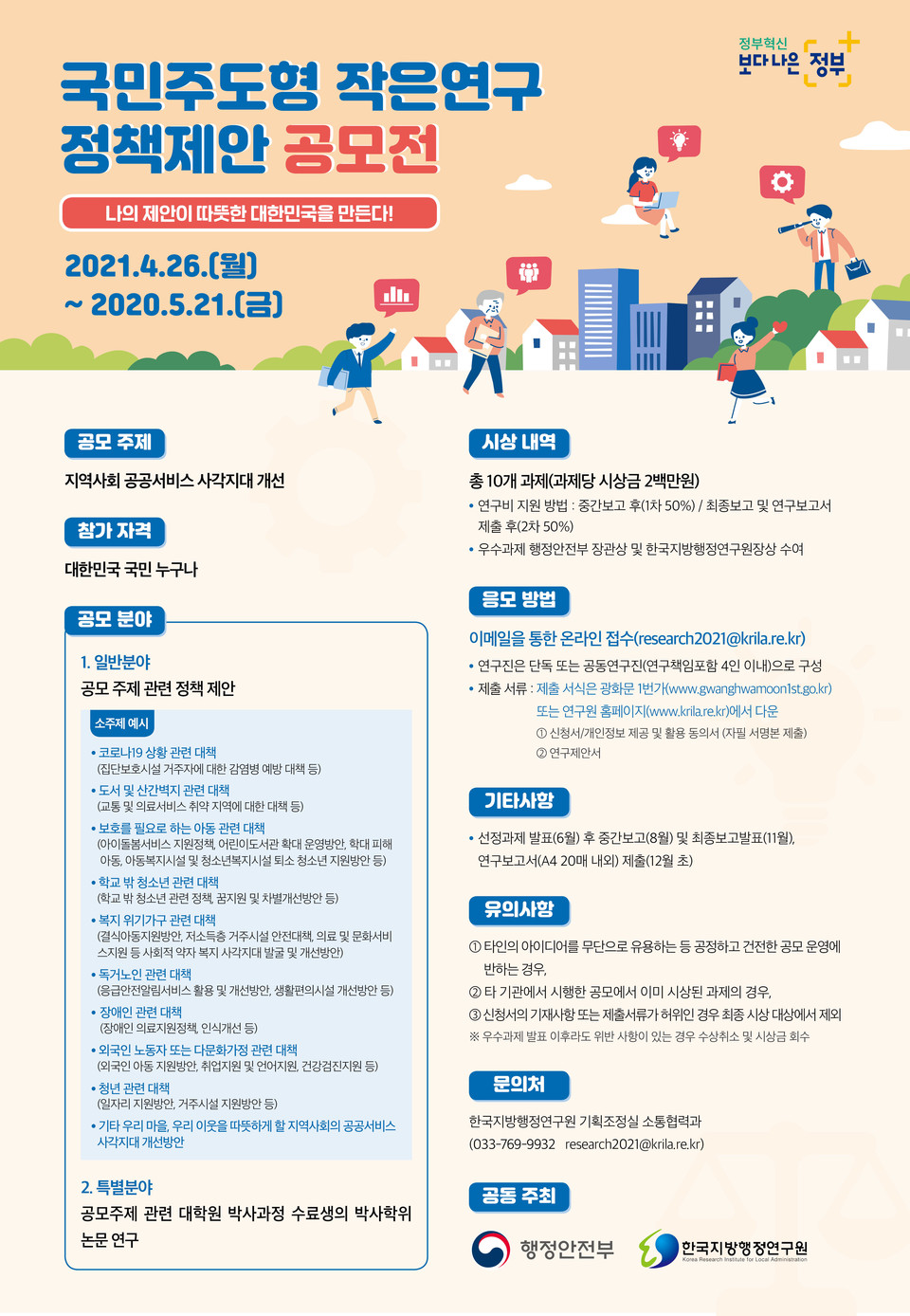 행정안전부(이하 행안부)는 한국지방행정연구원과 함께 ‘지역사회 공공서비스 사각지대 개선’을 주제로 국민이 직접 참여하는 ‘국민주도형 작은연구 정책제안 공모전’을 개최한다고 밝혔다.