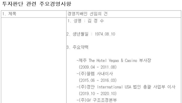 26일 회사는 구조조정과 경영 정상화를 위해 김정수 제주 더호텔&베가스 카지노 전 부사장을 경영지배인으로 선임했다고 공시했다. 그는 이달 초 횡령·배임 혐의로 직무정지 가처분 신청이 제기된 김철현 대표를 대신해 경영 업무를 맡을 예정이다.