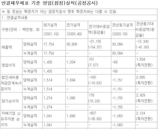 같은 기간 영업이익은 14억3500만원으로 흑자 전환했다. 전년 동기 영업손실은 6900만원이다. 증권가의 예상 영업이익은 65억원이었다.