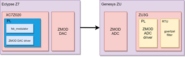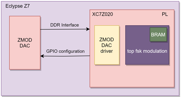 FSK용 반송 신호는 SoC의 블록 랜덤 액세스 메모리(BRAM∙FPGA에 많은 양의 데이터를 저장하는 메모리) 중 하나에 사인파(주기적, 연속적으로 진동하는 파동)로 저장된다. 클럭의 모든 엣지에서 BRAM의 주소로부터 값을 읽고 주소가 증분된다.