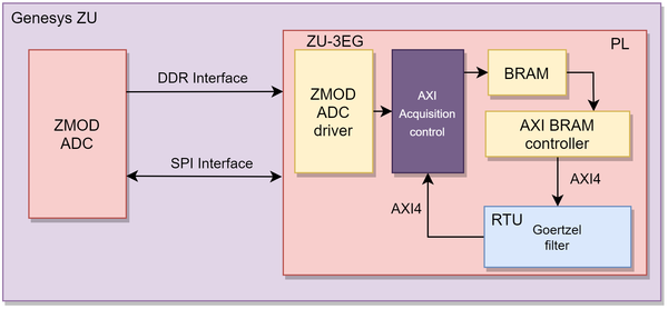 다음 그림은 징크 울트라스케일+ 블록, 지모드 ADC의 드라이버, 수집 제어 모듈, BRAM, 샘플을 저장하기 위한 AXI BRAM 컨트롤러 및 기타 AXI 블록을 포함한 복원 시스템에 대한 제네시스 ZU 기판의 블록 다이어그램을 나타낸다.