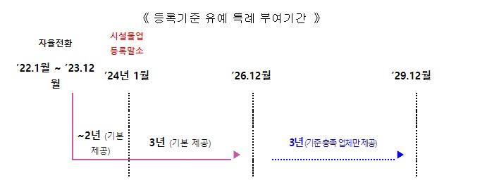 종전 시설물유지관리사업자 중 2026년(3분기)에 일정 기준을 충족하는 경우에는 등록기준 충족 의무를 2029년 12월 31일까지 3년 추가 유예한다.