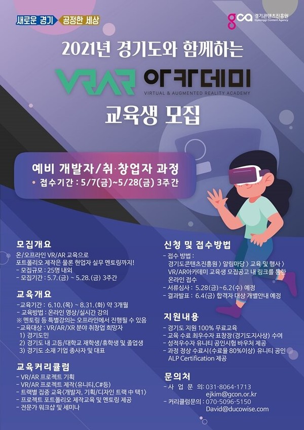 임문영 도 미래성장정책관은 “현업에서 바로 적용할 수 있는 최신 제작도구를 기반으로 한 실전형 교육 과정으로 관련 전문 인력을 양성할 계획”이라며 “실감기술 분야를 선도할 예비 개발자, 예비 창업자들의 많은 참여를 기대한다”고 말했다.