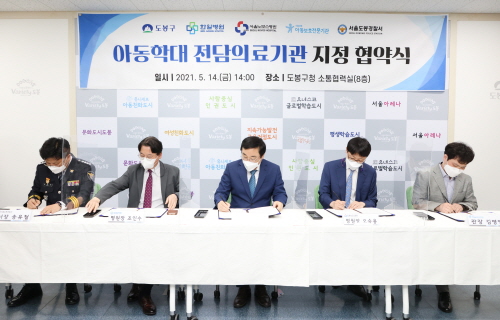 [테크월드뉴스=방제일 기자] 서울 도봉구는 5월 14일(금) 구청 소통협력실에서 학대 피해 아동의 신속한 의료 서비스 지원을 위해 한일병원(병원장 조인수), 서울노보스병원) 2곳을 아동학대 전담의료기관으로 지정하고 협약식을 진행했다.