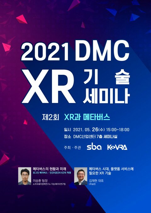 [테크월드뉴스=방제일 기자] 서울산업진흥원(SBA)와 한국가상증강현실산업협회이하 협회)가 함께 주최하는 ‘2021년 제2회 DMC XR 기술 세미나’가 5월 26일(수) 오후 3시 상암동 DMC 첨단산업센터에서 개최된다.