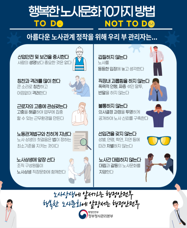 행정안전부 정부청사관리본부는 행복한 직장, 바람직한 노사관계 정립을 위해 ‘행복한 노사문화 구현을 위한 10가지 실천과제’와 ‘노무관리 간단 매뉴얼’을 제작·배포한다고 밝혔다.