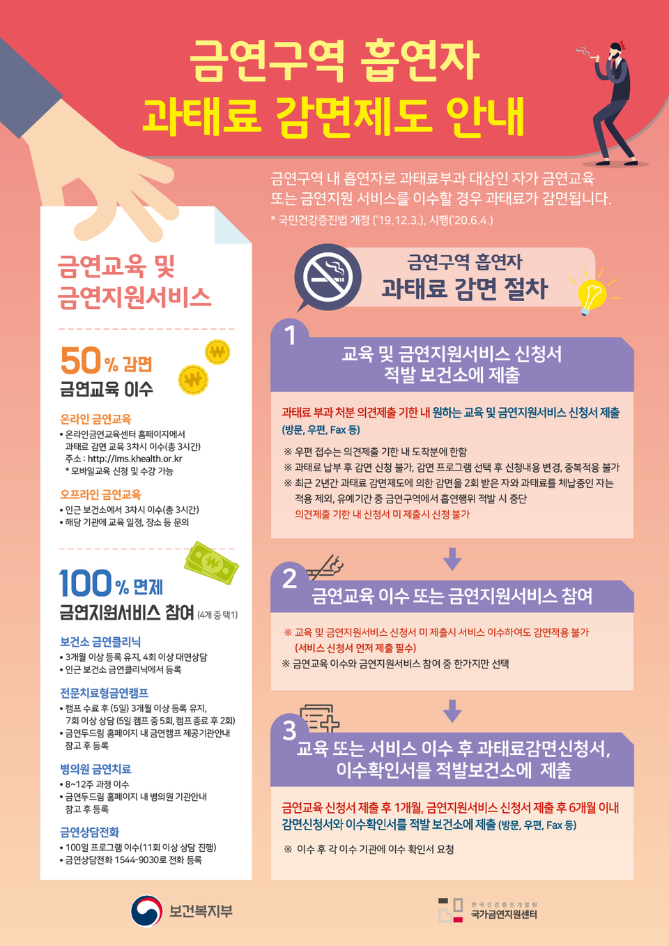 과거에는 금연구역 내 흡연행위로 인한 위반자에게 과태료만 부과했으나 2020년 6월부터 금연교육·금연지원서비스에 직접 참여해 과태료를 감면받고 금연할 수 있는 동기도 부여할 수 있게 됐다.