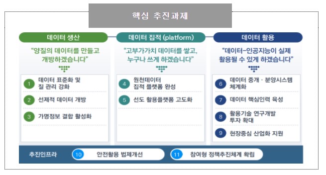 이터 활용 혁신으로 성과를 가속화하기 위해 안전한 데이터 제공 기반을 마련하기 위해 데이터 중개‧분양을 체계적으로 지원해 나간다.