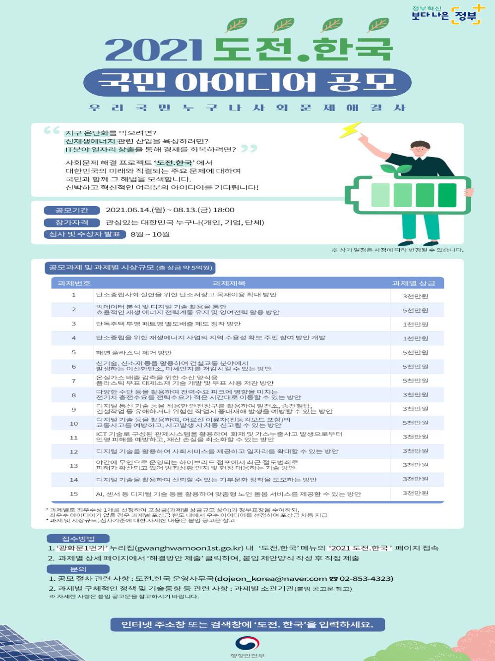 행정안전부(이하 행안부)는 사회현안과제와 지역사회문제에 대해 전 국민이 함께 해결방안을 찾는 ‘도전.한국’의 대국민 아이디어 공모를 6월 14일부터 시작한다고 밝혔다.