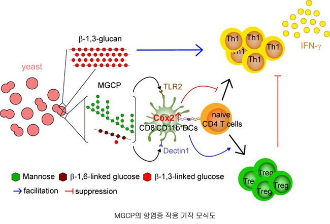 염증성 장 질환과 다발성경화증에 대한 실험 생쥐 모델을 활용한 연구를 통해 MGCP를 투여한 생쥐에서는 염증성 세포인 1형 도움 T세포(T helper type 1 cell, 이하 Th1 세포)의 생성을 억제했다. 반면에 항염증 기능을 갖는 조절 T세포(Regulatory T cell, 이하 Treg 세포)의 생성을 유도해 염증성 질병의 진행을 선택적으로 억제했다. 또한 MGCP에 의한 면역 억제 반응의 작용 기전이 각각 수지상세포에서 발현하는 두 가지 다른 선천성 면역 수용체인 TLR2와 Dectin1에 매개되는 것을 확인했다.