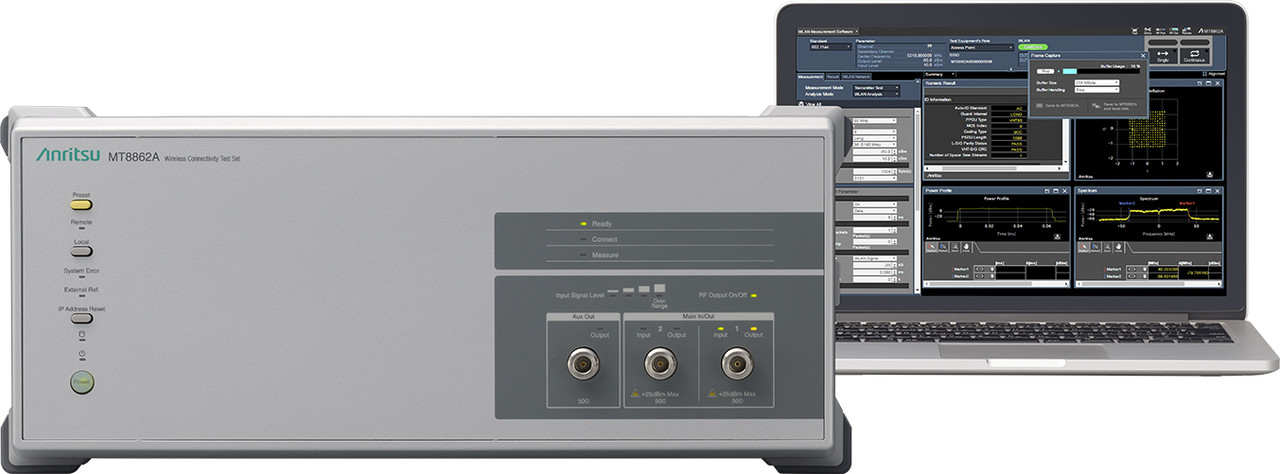 MT8862A는 IEEE 802.11a/b/g/n/ac/ax WLAN 디바이스의 무선주파수(RF) 송·수신 성능을 평가하기 위해 설계됐다. 2.4/5/6㎓ 대역 RF 송·수신 측정을 구현하고, IEEE 802.11 표준에 정의된 성능 평가와 CTIA, Wi-Fi Alliance에 의해 정의된 OTA(Over-The-Air) 성능 테스트도 지원한다.